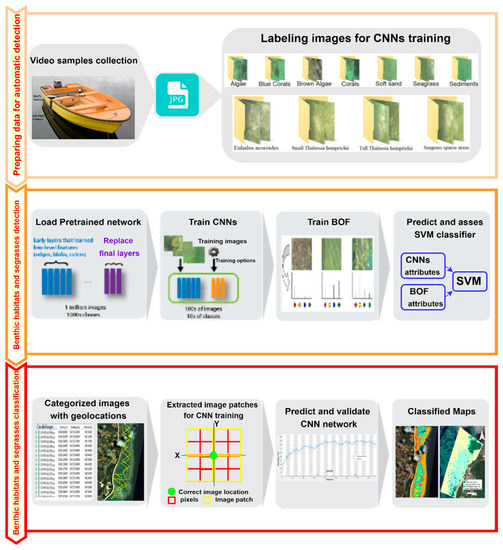 The framework proposed in this study has 2 successive processes. First, benthic habitats and seagrasses were detected by SVM [39,40] classifier using attributes extracted from pre-trained CNNs and a BOF [41,42] approach. Second, the correctly detected images were used as field samples for training a CNN with a simple architecture in order to map benthic habitats and seagrasses. These processes were conducted in the MATLAB environment.