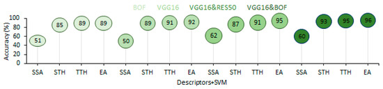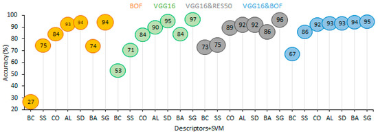 The overall accuracies for each benthic habitat and seagrass species categorized from the SVM classifier using BOF and VGG16 attributes are shown in Figure 7 and Figure 8, respectively. In addition, Table 1, Table 2 and Table 3 summarizes the corresponding recognition OA and kappa values for each of the tested methods. Furthermore, Table 2, Table 3 and Table 4 present the confusion matrices for the detection of benthic habitats and seagrass species using the BOF and VGG16 descriptors along with the SVM classifier.