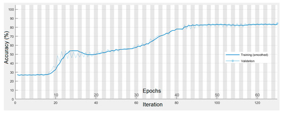 The training and validation accuracy progress of the proposed CNN for the Shiraho benthic habitats and Fukido seagrass species is shown in Figure 9 and Figure 10, respectively. In addition, Table 5 and Table 6 show the resultant confusion matrices from benthic habitat and seagrass species classification using the proposed CNN. Finally, the resultant classified maps for the Shiraho benthic habitats and Fukido seagrass species are presented in Figure 11.