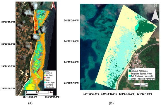 The resulted CNNs classified maps in Ishigaki Island, Japan: (a) Shiraho area benthic habitats map (b) Fukido cove seagrasses maps.