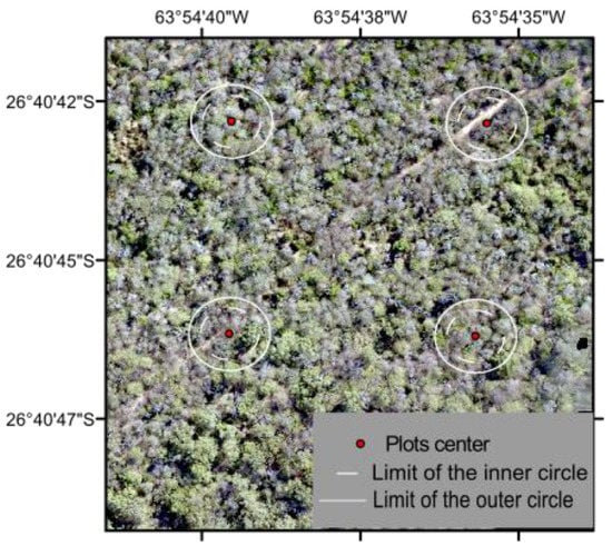 Field data on forest structure, function, and composition is available from forest inventory plots that were monitored by the Instituto de Ecología Regional of the University of Tucumán [24,32]. In the Dry Chaco, fifty forest vegetation clusters were surveyed on a regular basis, starting in 2007, and revisited in 2012 and 2017–2019. Of the fifty clusters, we selected sixteen clusters as to cover the existing gradient in forest degradation state. Each cluster contains four circular forest inventory plots of 1000 m2 (Figure 2), resulting in 16 × 4, i.e., 64 forest inventory plots. With a Garmin 12XL and eTrex Legend H GPS, we determined the absolute location of the center of each plot with a precision of 2 to 3 m. The position of individual trees within the plot was then measured in a relative coordinate system, measuring the azimuths and distances to the plot center. For the field inventory, the circular plots are divided in two concentric circles, with an inner and outer circle of respectively 500 and 1000 m2 (Figure 2). In the inner circle, all trees with a diameter at breast height (DBH) greater than 0.1 m are recorded, while only trees with a DBH greater than 0.2 m are documented in the outer circle. During the forest inventory, the team documented the tree species, and measured for each individual tree (n = 2022) the DBH with diameter tape (m). The tree height (m) was determined in 24 of the 64 inventory plots using trigonometric methods using a clinometer and laser distance meter. In 16 plots, tree height was estimated using visual estimations techniques. The basal area (m2) was derived from the DBH. The aboveground biomass (Mg·ha−1) of tree species was estimated from the DBH measurements and published data on wood specific gravity [33] using the allometric equations presented in Table 1 [34,35].