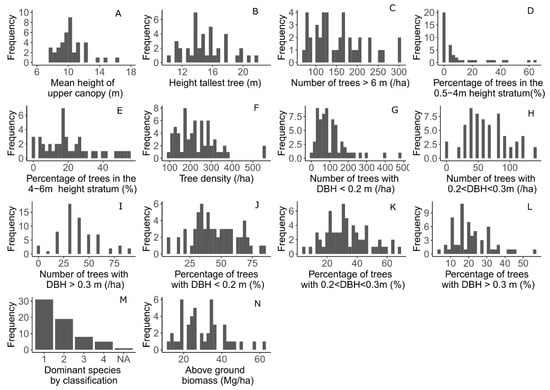 For the 40 plots of 1000 m2 for which tree height data are available, the mean height of the upper canopy ranges between 7.5 and 16.0 m, with a mean and standard deviation of 10.3 ± 1.8 m. The distribution is slightly left-skewed (Figure 4A), and similar to the distribution of values of the height of the tallest tree. The tallest tree is on average 15.3 ± 2.7 m, with a minimum of 10.2 and a maximum a 21.7 m. The number of trees above 6 m is slightly left-skewed, ranges from 70 to 300 trees per hectare, with a mean of 153.0 ± 60.7 trees·ha−1 (Figure 4C). The percentage of trees in the shrubby and the sub-canopy strata varies strongly between plots, with values ranging between 0.0 and 64.1% for the shrubby and between 6.2 to 55.0% for the sub-canopy. The average and standard deviation for the 0.5 to 4 m and 4 to 6 m height strata are respectively 10.4 ± 16.5% and 21.2 ± 14.9%.