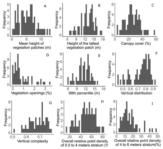For the 64 plots, nine indicators were extracted from the point cloud and canopy height model (Table 3 and Table 4). The mean height of the vegetation patches varies between 6.1 and 11.2 m, with an average of 8.1 ± 1.2 m. As shown in Figure 5A, its distribution is left-skewed. Compared to the mean height of the vegetation patches, the height of the tallest vegetation patch shows a wider spread with values between 6.9 and 17.6 m, and average value of 12.8 ± 2.4 m. The canopy cover shows a normal distribution (Figure 5C), varying between 2.8 to 56.6%, and average of 25.6 ± 10.8%. In the 64 plots, the vegetation openings are generally small and of minor extent, with more than 84% of the plots having values below 15%.