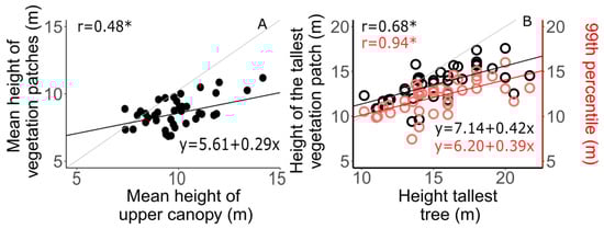Comparison of the forest height indicators that were derived from the UAV-SfM data and the field-based measures of canopy height. The field data are plotted on the X-axis, while the UAV-SfM derived indicators are plotted on the Y-axis with the mean height of vegetation patches for (A) and the height of the tallest vegetation patch for (B). The Spearman correlation coefficients are calculated at the plot level (n = 40). If the p-value of the correlation analysis is less than 0.05, the correlation coefficient is flagged with one star (*).