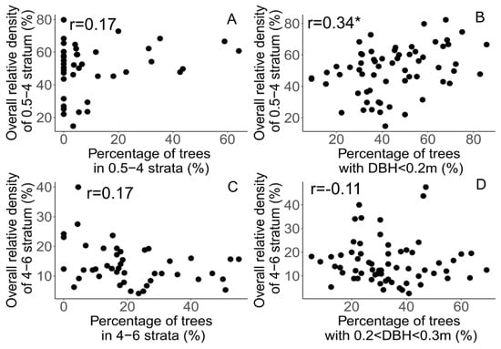 The UAV-SfM data (n = 64) on vegetation openings, compared with ground measurements on the total tree density (ha−1) for panel A, and the density of trees (ha−1) with DBH < 0.2 m for panel B, between 0.2 and 0.3 m for panel C and > 0.3 m for panel D. The field data are plotted on the X-axis, while the UAV-SfM based indicator on vegetation openings is plotted on the Y-axis. The Spearman correlation coefficients are calculated at the plot level (n = 64). If the p-value of the correlation analysis is less than 0.05, the correlation coefficient is flagged with one star (*).