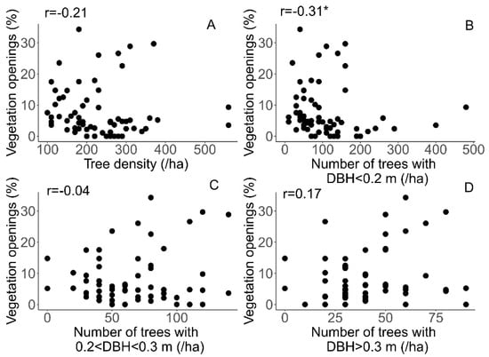 Similar to canopy cover, indicators of vegetation openings are poorly validated in the literature, and rarely quantified by ground-based measurements. Tools such as hemispherical photographs or terrestrial laser scanners are not well suited for this purpose [64]. Here, we assessed vegetation openings from the canopy height model. We observed that the number of thin trees (DBH < 0.2 m) is systematically lower for plots having more than 10% of the area with vegetation openings. The negative correlation is significant but there is a lot of spread in the data (Figure 8).