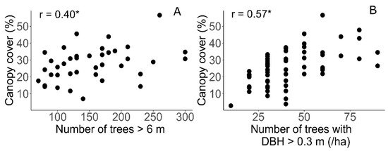 The UAV-SfM data on canopy cover (%), compared with (A) ground measurements on the number of trees taller than 6 m (ha−1), and (B) the number of trees with DBH above 0.3 m. If the p-value of the correlation analysis is less than 0.05, the correlation coefficient is flagged with one star (*).