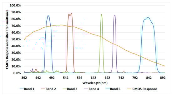 Radiometric calibration was implemented on a miniaturized multispectral camera manufactured by MicaSense, Inc., America. MicaSense RedEdge-MX is an advanced multispectral camera specially designed for small, unmanned aircraft systems. It includes compact bundles (rigs) of five cameras with CMOS sensors. The size of each CMOS sensor is 1280 × 960. This multispectral camera uses narrow-pass filters to control the incident light and can simultaneously capture five discrete spectral bands (blue, green, red, red edge, near-infrared) [,,]. The detailed parameters of the sensor are displayed in Table 1. The spectral response of the sensor and transmittance of filters for each band are shown in Figure 1 [].