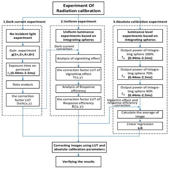 The electro-optical performance of sensors is mainly affected by three intrinsic elements: dark current, vignetting effect, and detector response [,,]. These are apparently non-uniform in each pixel and have the characteristics of spatial configurations within the images [,,]. These phenomena are more serious in CMOS sensors [,,,,]. The dark current is related to the sensor’s temperature, gain, and integration time, and it is corrected by estimating the non-uniformity of the dark signal [,,]. The non-uniformity of the dark current is usually eliminated through image templates obtained by blocking the lens under normal working conditions [,,]. Vignetting correction is a challenging process, and it is usually performed by two methods: the lookup table (LUT) method [,] and the polynomial fitting method []. The LUT method is considered to be the most accurate method for vignetting correction [,]. The response factor may vary randomly among detectors due to the inherent cell-to-cell variations introduced during the manufacturing process. D. Olsen et al. [] determined correction coefficients to minimize the effects of optical vignetting, non-uniform quantum efficiency of a CCD, and dark current of a CCD using a least-squares fit approach. Moreover, when the radiation intensity is converted to a digital number (DN), the quantized value varies with the tunable parameters of sensors such as integration time and gain. Therefore, the DN needs to be normalized with different camera settings [,,]. The parameters of absolute radiometric calibration including correction coefficients and offset are typically derived using a linear model [,,]. However, a clear understanding of the representativeness of image templates for non-uniform dark current and the relationship between dark current and sensor characteristics (e.g., integration time and gain) is lacking in the existing literature. Moreover, vignetting correction has been primarily based on the mathematical model of the polynomial fitting, and the LUT method with higher precision has been rarely used for this correction.