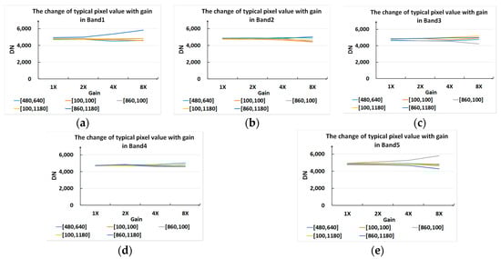 Variation in the typical pixel value with gain for: (a) Band1; (b) Band2; (c) Band3; (d) Band4; (e) Band5.