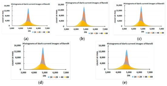 Histograms of dark current images at different gain settings for various bands: (a) Band1; (b) Band2; (c) Band3; (d) Band4; (e) Band5.