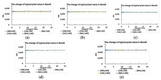 Variation in the typical pixel value as a function of integration time for various bands: (a) Band1; (b) Band2; (c) Band3; (d) Band4; (e) Band5.