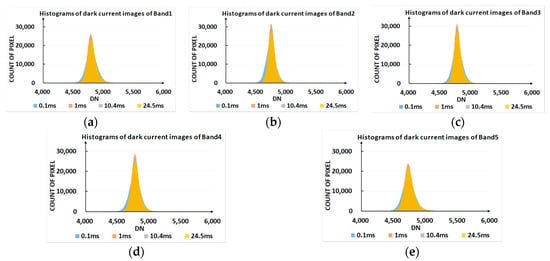Histograms of dark current images at different integration times (0.1, 1.0, 10.4, and 24.5 ms) for various bands: (a) Band1; (b) Band2; (c) Band3; (d) Band4; (e) Band5.