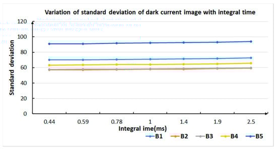 The histograms of dark current images were slightly changed under different values of integration time. To clearly display the statistical features of images, the standard deviation (STD) of the dark current image was selected to quantify this change. The STD of the dark current image in the integration time range of 0.44–2.5 ms, which is typically used for a multispectral camera in aviation applications, was statistically analyzed, and the results are shown in Figure 9.