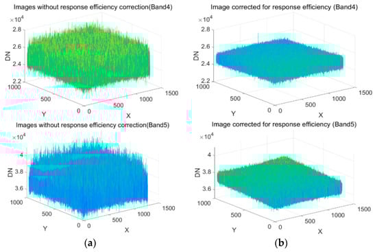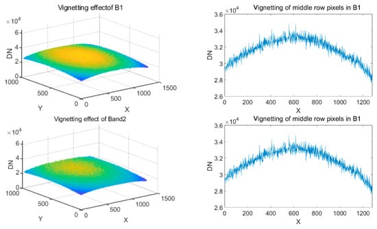 Firstly, relative radiometric calibration made DN values comparable within the image. The main task of the relative radiometric calibration was to eliminate the influence of dark current, vignetting effect, and non-uniform detection efficiency [,,,,].