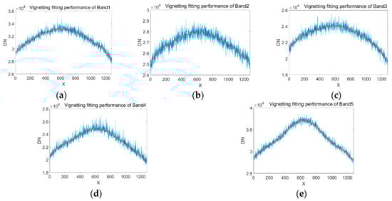 Based on Equations (5) and (6), the Gaussian filter template was created by inputting the appropriate STD . The convolution algorithm was used between the and Gaussian filter ( template to generate the vignetting images. The fitting performance of all the bands are shown in Figure 11.