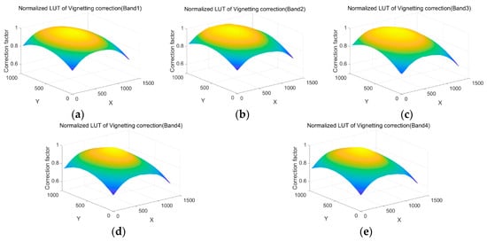 Then, the correction factor LUT of the vignetting effect was obtained by normalizing these images according to Equation (7). The normalized LUT of the vignetting effect of all the bands are displayed in Figure 12.