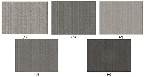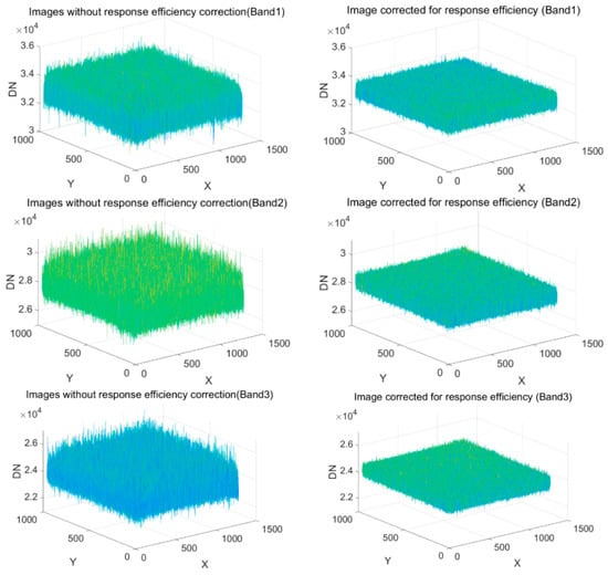 The images obtained under the same output radiation intensity of the integration sphere and camera settings were corrected for dark current and vignetting effect. Their mean image was calculated to eliminate the random noise. The response differences that were retained in the images are shown in Figure 14. An obvious stripe noise was observed in the images of each band.