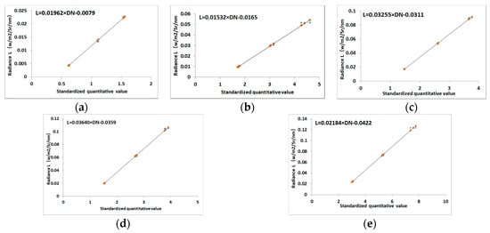 Thirdly, absolute radiometric calibration converted DN into physical units of radiance (). A linear empirical model is often used for absolute radiometric calibration [,,,].