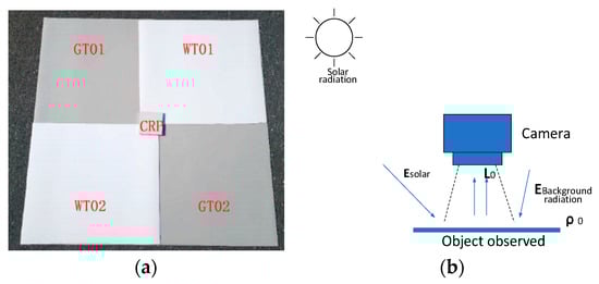 Five observation targets were combined: calibrated reflectance panels (CRP) provided by the manufacturer, white target01 (WT01), white target02 (WT02), gray target01 (GT01), and gray target02 (GT02). As shown in Figure 17a, the observation targets were arranged on flat ground.