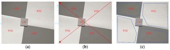 Images obtained by the multispectral camera (Band1 as an example): (a) Band1 image of targets; (b) diagonal pixels of five spectral images selected for relative accuracy; (c) areas selected for analyzing pixel statistics of images.