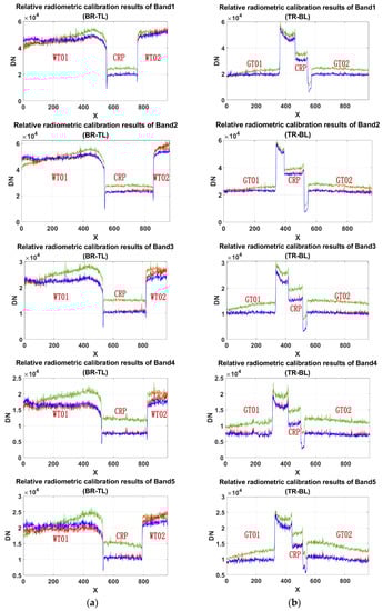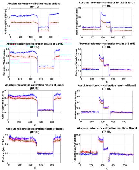Compared to Figure 19, there was a large deviation between the radiance value derived by two methods after normalization and absolute radiometric calibration. This is more obvious in the images of Band1 and Band2 in Figure 24. The curve of diagonal pixels is obviously raised on the left side and decreased on the right side in Figure 24b, reflecting the adverse effects of line correction of integration time in the manufacturer’s method.