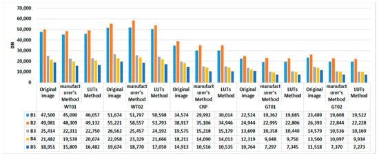 It is evident from Figure 20 that the interval between the mean of the DN of WT01 and that of WT02 in the corrected results increased as compared to that in the original images. This may be attributed to the tilt observed by the sensor. However, the mean of DN of other similar targets became closer than before. This indicated the effectiveness of the two calibration methods. Moreover, the mean DN of all the same targets corrected by the LUT method was more uniform than that of the same targets corrected by the manufacturer’s method, as shown in Figure 20. This implied that the effect of the LUT method was better than that of the manufacturer’s method.