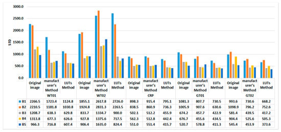 The STD of the DN of the WT02 target in the corrected images based on the two methods was larger than that of the original images. This also indicated the problem of sensor tilt similar to Figure 19a and Figure 20. However, the STD of other targets became smaller than that in the original images. This confirmed that the uniformity of the image was improved. Besides, the STD of all the targets corrected by the LUT method was smaller than that of the targets corrected by the manufacturer’s method. This indicated that the images corrected by the LUT method had better uniformity than those corrected by the manufacturer’s method.