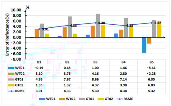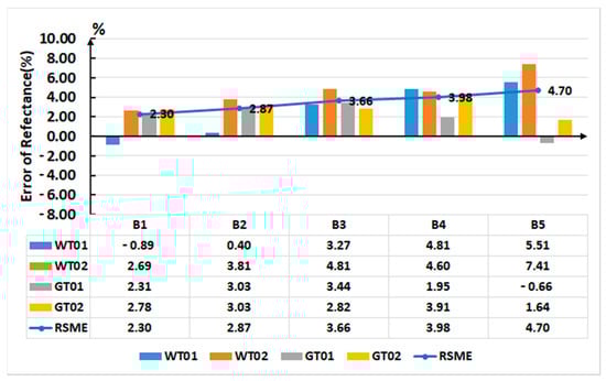 The average reflectance of WT01, WT02, GT01, and GT02 was extracted from the reflectance images calibrated by the LUT method and the manufacturer’s method. Then, the absolute error and RSME were calculated according to Equations (10) and (11). The reflectance error of targets in the five spectral images corrected by the LUT method and manufacturer’s method is shown in Figure 22 and Figure 23, respectively.