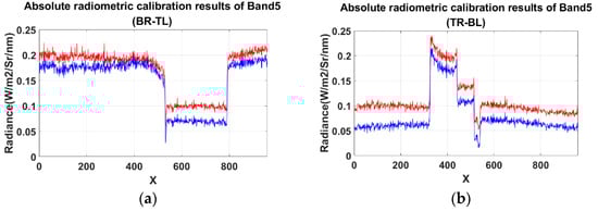 Diagonal radiance value of the spectral images calibrated by the LUT method (blue) and manufacturer’s method (red): (a) radiance value of BR-TL diagonal in five bands; (b) radiance value of TR-BL diagonal in five bands.