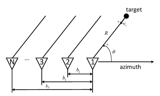 where denotes the complex amplitude of the reflectivity of the scatterer; is the wavenumber; is the radar wavelength; , with , is the two-way characteristics of the nth antenna; is the space steer vector; is the directional cosine; and is the direction of arrival (DOA) since the squint angle is assumed zero, as shown in Figure 1. Vectors (matrices) are denoted by boldface lower (upper) case letters.