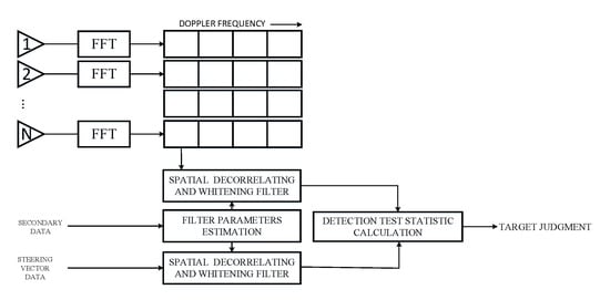 The post-Doppler space–time adaptive processing (PD-STAP) is a reduced rank algorithm of the classical joint domain STAP in the range-Doppler domain. The post-Doppler adaptive matched filter (PD-AMF) is a standardized version of PD-STAP and has the constant false alarm rate (CFAR) property in practical applications. First, doppler filtering is performed on the element signals; then, spatial adaptive beamforming is performed, that is, spatial whitening; and finally, target detection is achieved [5,9]. Compared with conventional STAP, PD-AMF has a wide application in the field of moving target detection due to the relatively small sample support requirement, especially in radar systems with longer coherent processing intervals (CPIs) and medium or large arrays [5]. Unfortunately, PD-AMF also has requirements for the training data size and content (i.e., RMB and I.I.D.). It is basically ineffective in a dense signal environment. More recently, a knowledge-aided (KA) algorithm showed that the generalized inner product (GIP) test can be applied in the space-Doppler domain in order to remove the nonhomogeneous training data from the DCM estimation. However, the use of KA algorithms further increases the complexity of STAP, especially when real-time processing is required [8,10].