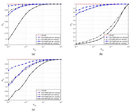 Figure 3a–c shows the ROC curves of the relationship between the and the false alarm probability ( ). The simulation parameters SINR is 13 dB, and PD-MF (red dashed line) is used as the best performance reference curve. The ROC curve is obtained through a Monte Carlo experiment of repetitions. The blue and black solid lines indicate the unknown target velocity, which is obtained by searching over the range of the target velocity, and the blue and the black dashed line are obtained by the known target velocity. As we can see, compared with their detection performance of known target parameters, both PD-PAMF and PD-AMF have a certain performance loss, which is caused by their parameter estimation step. Among them, Figure 3a is the ROC obtained under K = 2 N = 22 training data, the size of which conforms to the RMB rule. It can be seen that, when the target velocity is known, the performances of the PD-PAMF and the PD-AMF are basically similar and are close to the performance of the PD-MF. However, when the target velocity is unknown, the performance of PAMF degrades a little, while PD-AMF degrades obviously. Thus, the PD-PAMF outperforms the PD-AMF. Figure 3b is obtained in the case of K = 8, that is, for the PD-AMF, the training data is insufficient, so we see a sharp decline in PD-AMF detection performance regardless of known or unknown target velocity. Compared with the training data K = 22, the performance loss of PD-PAMF is very small, which is closer to PD-MF. Figure 3c simulates the dense signal environment, and the training data contains the moving target signal (the same parameters as the moving target signal to be detected). The training data size of the PD-PAMF detector is K = 8, and the PD-AMF is K = 22. The results show that the detection performance of PD-AMF generally has no loss, while the performance loss of PD-AMF is more serious than that in Figure 3a, which may be caused by self-whitening. In other words, the PD-PAMF tolerates the moving target signal in the training data.