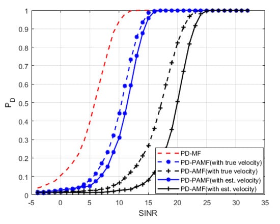 The theoretical performance of the PD-PAMF is studied via computer simulation. In other words, using the Monte Carlo simulation method to evaluate the estimation of the detection probability () and velocity under different conditions. Part of the simulation parameters are shown in Table 1. The target with and is tested, and the main beam angle of the radar is 90 (i.e., side-looking radar). The clutter to noise ratio (CNR) is 10 dB.