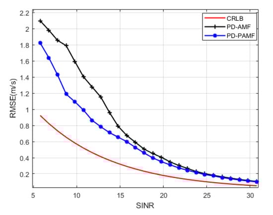 Next, we examine the estimation performance of velocity. Velocity is obtained through the maximum likelihood estimation in Equation (33). Figure 5 shows the RMSE of PD-PAMF (blue line) and PD-AMF (black line) with SINR variation. As a reference, we also draw the Cramer Rao Lower Bounds (CRLBs) of the velocity estimation [35]. The results show that, as SINR increases, the RMSE of both detectors decreases, which is closer to CRBL. When SINR < 25 dB, the estimated error of PD-PAMF is smaller than that of PD-AMF. When SINR = 25 dB, the RMSE curves of PD-PAMF and PD-AMF coincide, which is consistent with the results in Figure 4. Therefore, with the support of small samples and low SINR, PD-PAMF has better velocity estimation accuracy, which is closer to the CRBLs.