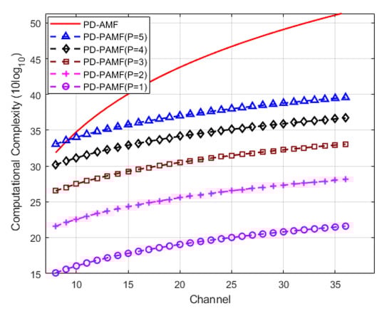 Lastly, we discuss the computational complexity of the PD-PAMF and the PD-AMF in Figure 6. From Section 4, the computational complexities of PD-PAMF and PD-AM are both related to the training data size K and the number of channels N. In addition, the computational complexity of PD-PAMF is related to the order P of the AR model. Taking into account the number of variables and RMB criteria, this section selects K = 2 N (i.e., RMB requirement), even though PD-PAMF does not require such a large number of samples. The results show that, as the number of radar channels N increases, the computational complexity of PD-AMF increases sharply while the slow increase of PD-PAMF is only caused by the increase in training data K. However, the training data size of the PD-PAMF does not have to follow the RMB requirement because it can achieve higher performance with a small size data. Thus, the proposed PD-PAMF has lower computational complexity.
