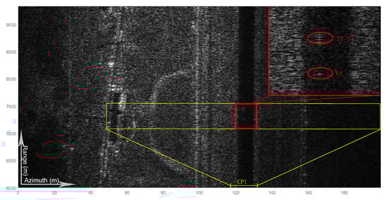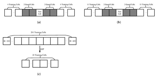 To demonstrate the effectiveness of the proposed PD-PAMF detector, we further conduct experiments by using the simulated radar data in a dense signal environment. Here, we utilize an airborne synthetic aperture radar (SAR) image scene (as shown in Figure 7, the azimuth is 2000 cells and the range is 800 cells) to simulate the echoes of an airborne array radar with 11 channels via point target simulation (details of the simulation method can be referenced in [36]). Obviously, there are many heterogeneous and strong discrete scatterers in the scene. The system and geometry parameters are shown in Table 2. Considering that a moving target should remain in one doppler cell during the integration time, 128 pulses and 800 range bins are chosen. The processing CPI is shown in Figure 7, and the yellow rectangle area is the background of clutter when detecting targets in the range-Doppler domain. To evaluate the performance of the PD-PAMF in a dense environment, five injected moving targets are placed in range cells R = 302, 348, 352, 356, and 359. They are all with = 90, radial velocity = 2 m/s, and Signal to clutter ratio (SCR) = 2 dB (noticing the heterogeneous clutter, we consider local clutter for SCR). The training data containing target signals will sharply degrade the detection performance because of target cancelation by self-whitening. For the problem considered here, we choose the same velocity in order to test the detection performance of the proposed PD-PAMF under more difficult detection conditions. All signals are discrete in range (i.e., each signal occupies only one range cell). It presents a very difficult detection problem under this situation since the signals in the “adjacent cells” that have the same signal steering vector as that in the “test cell” enter the training data used to estimate and reject the disturbance. As a consequence, the “test cell” signal may be self-whitening. Test cell processing occurs in the interval from range cells R = 220–420. In order to research the effects of the training data size and content on the PD-PAMF and the PD-AMF, we consider three test cases. The first test case is to utilize K = 12 training data (small samples) and a moving window consisting of 16 range bins for processing. Four guard range cells are used on the test cell, as shown in Figure 8a. The second test case is to utilize K = 2 N = 22 training data (satisfying RMB rule) and a moving window consisting of 26 range bins for processing, and four range guard cells are used on the test cell, as shown in Figure 8b. The third test case is to use the GIP strategy of training data screening, which eliminates the nonhomogeneous training data containing target signals [10,18]. A fixed window is used. Among the 201 range bins from R = 220 to R = 420, K = 2 N = 22 training data are selected for training, as shown in Figure 8c.