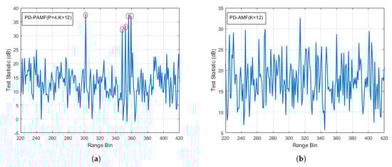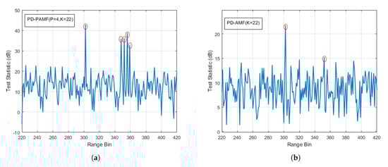 Figure 9a,b show the detection results of the PD-PAMF by using model order P = 4 and the PD-AMF in test case 1, respectively. As we can see, the proposed PD-PAMF accurately detects five moving targets while the PD-AMF does not because of target self-whitening. For the test statistics of the PD-PAMF, the target signals are at least 17 dB above the 15 dB mean value. Additionally, the highest background peak is 8 dB below the lowest target peak. Thus, the PD-PAMF detector outperforms the PD-AMF detector.