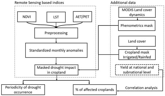 Remote sensing time series have been used extensively for assessing the impact of drought on terrestrial ecosystems as proxies of biophysical vegetation properties can be extracted over large scales []. Several indices have been proposed for the detection of anomalies in the intensity, continuity, and spatial extent of droughts [,,]. The availability of remote sensing data allows the estimation of vegetation indices (VI), such as the normalized difference vegetation index (NDVI); and consequently, the detection of anomalies in vegetation productivity [,,]. Furthermore, other metrics, such as evapotranspiration (ET), land surface temperature (LST), or soil moisture, can be extracted based on different satellite sensors [,,,,]. Time series of these remotely sensed parameters enable the assessment of drought characteristics, such as duration and severity [,]. The use of remote sensing has been highlighted for the particular regions (such as East or West Africa) where other measures of drought (e.g., climate station records, yield information) are not available []. Although these indicators were shown to be effective for drought monitoring at different scales, they have shown some limitations, such as sensitivity to non-drought-related factors such as changes in management practices or land cover changes. Furthermore, as drought is the result of interaction between precipitation, temperature, evapotranspiration, soil moisture and ground water levels, an index applicable for one region may not be suitable elsewhere. Therefore, generalizing the results across various regions needs further analysis [].