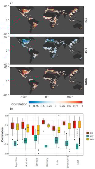 Pearson’s correlation coefficient (r) estimated for a maize yield anomaly (based on gridded yield data) with (a) land surface temperature (LST), evaporative stress index (ESI), and normalized difference vegetation index (NDVI) anomalies (peak of the growing season) and (b) boxplots extracted for selected countries.