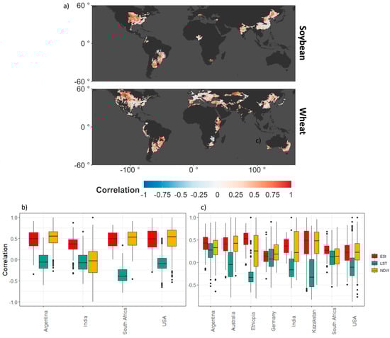 Pearson’s correlation coefficient (r) estimated for (a) soybean and wheat yield anomalies with the ESI anomaly and boxplots extracted for selected countries showing comparison with other indicators for (b) soybean and (c) wheat.