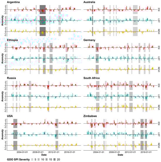 To analyze the temporal development of the drought impact, we aggregated drought anomalies for selected administrative units (Figure 5). Anomalies of the NDVI, LST, and ESI revealed 1 (moderate drought) to 2 (extreme drought) negative standard deviations over different countries, indicating severe drought impacts. The countries Argentina, Australia, Ethiopia, Germany, Russia, South Africa, USA and Zimbabwe were chosen based on the suboptimal conditions observed at the global level analysis, to further analyze the temporal patterns of drought propagation. We included at least one country per continent to reflect the patterns in areas with different environmental as well as socio-economic characteristics.