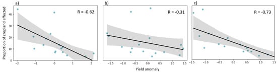 Relationship between the area affected by drought (based on the ESI anomalies andyields) of (a) soybean, (b) wheat, and (c) maize yield for South Africa in period 2001–2017. The 95% confidence interval was determined by bootstrapping and is illustrated as the dark gray area.