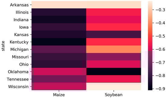 Similarly, in the main crop growing states in the central USA, negative linear associations can be observed for both soybean and maize. Figure 7 shows the correlation matrix of correlations between the proportion of affected crops and yield anomaly over six states, depicting strong negative correlations with r ranging from −0.5 to −0.9. This depicts that the initially derived global products are relevant and can be used at a regional scale.