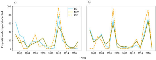 Percentageof crop area affected by drought based on anomalies of ESI, NDVI and LST derived from MODIS for (a) Iowa (US, July) and (b) Free State (South Africa, February) in period 2001–2017.