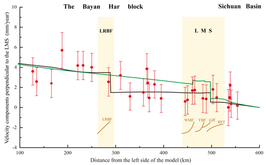 As is known to all, the dextral strike-slip rate of LRBF can reach to 5.4 ± 2.0 mm/yr. [24]. However, in this paper 2D models were used, so we can only absorb the horizontal motion component through the creeping of LRBF, so as to ensure that the horizontal velocity on the west side of the LMS is equivalent to the actual GPS velocity perpendicular to the LMS. In order to further reveal the role of LRBF, we obtain the surface horizontal velocity results in Model 4 with (black line in Figure 3) or without considering LRBF (green line in Figure 3). By comparing the two horizontal velocity results, we can infer that the absorption of LRBF to horizontal velocity is irreplaceable, which is consistent with the 1–2 mm/yr. reduction of GPS velocity [22,23] across the fault LRBF. The modelling deformation results (black line) is in good agreement with the GPS velocity component, which shows the gradual decrease of GPS horizontal velocity from west to east, further more; it shows a sharp change across the LRBF, the horizontal velocity in the west of LRBF is about 3.5 mm/yr., while it decreases to about 1.5 mm/yr. to the east of LRBF, and across the LMS, the horizontal velocity decreases again to about 0.5 mm/yr.. The simulated results show that there is another velocity reduction across the GJF, which proves that the GJF is in a creeping state in the fault structural system of LMS. We cannot judge the velocity variation of several faults in LMS only by GPS observed velocity component, because of itself low value and within the error range. The Wenchuan earthquake Fault Scientific Drill [28] results through the GJF confirm that the GJF is a seismic fault with long-term creeping properties. The creep state of the GJF reflected by the reduction of horizontal velocity simulated by Model 4 is similar to the actual drilling results. Therefore, the simulation results in Model 4 are consistent with GPS velocity in horizontal deformation field.