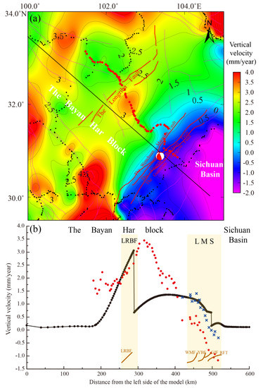 Then, in order to verify the vertical velocity results of the model, we collected the precise leveling data observed around the eastern margin of the Tibetan Plateau. The Leveling Networks were used for Seismic Application spanning the major active faults in China and surveyed by the China Earthquake Administration for the period of 1970 to 2009 [40]. The precise leveling data reflect the uplift rate of the Bayan Har block before the Wenchuan earthquake (Figure 4a) and the misclosures are within ±0.5 mm/km. There is a leveling survey route (the red point in Figure 4a) near the north of our two-dimension model, and the vertical deformation rate changes obviously from west to east. The precise leveling results (Figure 4a) show that in the area about 300 km wide in the west of LMS, the vertical deformation presents a convex shape with high value in the middle and low value on both sides. In the vicinity of LRBF, there is a significant vertical uplift deformation with the maximum uplift rate of 3.4 mm/yr.; the vertical velocity is about 2.0 mm/yr. at 100 km from the east and west sides of LRBF; and from LRBF to LMS, the vertical deformation rate decreases rapidly, from 3.4 mm/yr. in the east side of LRBF to −0.1 mm/yr. in the east side of LMS. The black curve with dots in Figure 4b shows the simulated vertical velocity results of Model 4 in the last 1000 years, in which the maximum velocity on the hanging wall of the LRBF reaches 3.0 mm/yr. The vertical velocity on the west side of LMS can reach 1.4 mm/yr., and the closer to LMS, the smaller the velocity value, and when crossing the GJF, the velocity drops to 0.1 mm/yr. and then increases slightly, which we consider it is related to the surface uplift caused by the blind fault-RFT. The vertical velocity in the west side of LRBF and LMS is similar to the precise leveling data, but there is discrepancy near the fault. For LRBF, as we all know that there are two parallel faults in the middle section of LRBF [24], but only one in the south section. Whether there is another blind fault structure like RFT in LRBF is not known. We can infer from the actual precise leveling data (Figure 4a) that there is a prominent uplift area in the eastern part of the southern section of LRBF, which can be explained by the vertical deformation of RFT in LMS across the GJF (Figure 4b). Maybe the depth of the blind fault in LRBF is much shallower, and the vertical velocity is greater than that in LMS. However, these are not the focus of this paper; we mainly focus on the influence of fault structure in LMS. Therefore, it is necessary to ensure that the simulated vertical velocity (about 1.0–1.4 mm/yr.) is equivalent to the actual precise leveling data (about 1.0–2.0 mm/yr.), so as to ensure the accuracy of our simulation results. We simplify the LRBF as one creeping fault in this paper at last. In addition, for the subsidence of Sichuan basin (Figure 4a), the deformation mechanism of these areas was not so clear, so we will not discuss separately in this paper. However, we found that the actual precise leveling data varies greatly at the distance of 400 km; the reduction is about 0.92 mm/yr. If we add this variation back to the original data (blue cross point in Figure 4b), we find that variation trend of the actual precise leveling data is consistent with the simulation result in LMS. This also further verified the accuracy of our simulation result.