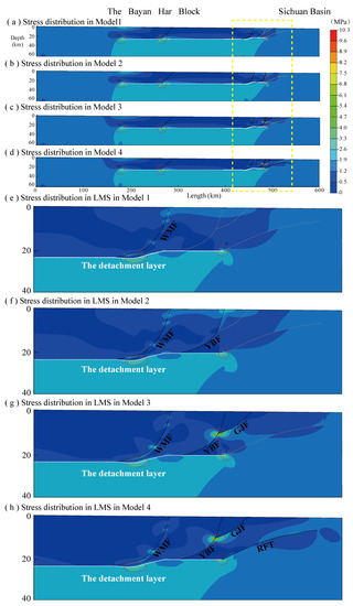 In order to show the equivalent stress distribution in the models clearly, we display the entire model results from Model 1 to Model 4 (Figure 6a–d), according to the overall stress distribution of the models, the results of each model are similar. The stress value is relatively high in the lower crust about 300 km west of the LMS, the equivalent stress value is 1.9–2.6 MPa; then to the west, the equivalent stress value decreases to 1.2–1.9 MPa; and the stress level of the whole crust and upper mantle in Sichuan basin east of LMS is relative low. However, the area of local high stress concentration is closely related to the position of fault intersection and detachment layer.