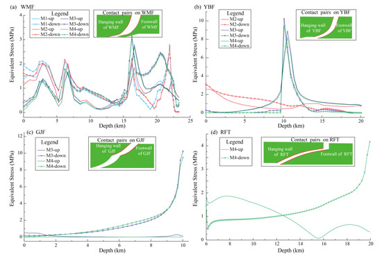 Distribution of cumulative equivalent stress on the hanging wall and footwall of the fault in LMS. (a–d) are WMF, YBF, GJF, and RFT from Model 1 to Model 4; Solid line: Equivalent stress on the hanging wall of the fault; Solid line with dots: Equivalent stress on the footwall of the fault; Red dots: Contact pairs on the fault; Cyan color: Results of Model 1; Red color: Results of Model 2; Blue color: Results of Model 3; Green color: Results of Model 4; Model 1 is simplified to “M1”, hanging wall of the fault is simplified to “up” and footwall of the fault is simplified to “down” in the legend; The ordinate represents the magnitude of equivalent stress which unit is MPa (1 × 106 Pa), and the abscissa represents the depth.