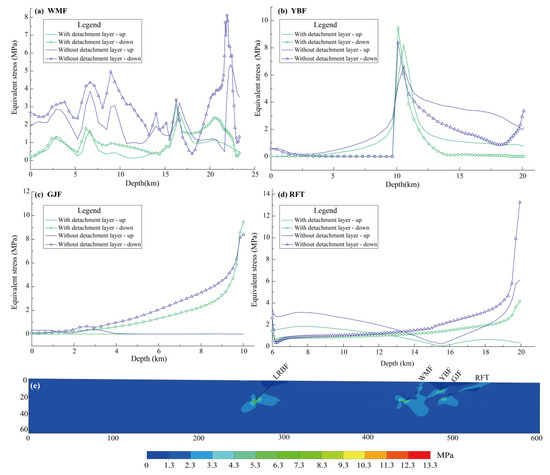 By comparing the stress distribution results of the entire models with (Figure 5d) and without detachment layer (Figure 7e), we can see that the stress distribution has changed significantly. When we did not consider the detachment, the stress is mainly concentrated at the bottom of LRBF, WMF, RFT as well as the bottom area where YBF and GJF meet in Figure 7e. We obtained the equivalent stress accumulation results on the hanging wall and footwall of the four faults in LMS with and without detachment layer, as shown in Figure 7a–d. The comparison results display that the model without detachment layer has a great effect on the stress accumulation at the bottom of RFT and WMF, compared with the result of Model 4 with detachment layer (Figure 5d), the maximum increase of stress accumulation on RFT at 20 km depth is 9.1 MPa (Figure 7d), and that of WMF at 22 km depth is 6.5 MPa (Figure 7a). In contrast, the variation of stress accumulation in the intersection of YBF and GJF is small (only about 1.1 MPa reduction), and even the stress accumulation increases at the bottom of YBF (Figure 7d). It can be seen that fault combination mode of YBF and GJF can accumulate a lot of stress no matter whether there is a detachment layer or not, and the existence of the detachment layer will further increase the stress accumulation at the intersection area of the two faults.